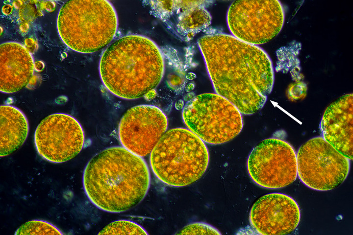 Als Chlamydomonas oder Microglena hat Herr Roman Romanov diese Algen bestimmt. Herzlichen Dank dafür! Weitere Merkmale im Vergleich deuten eher auf Microglena hin.